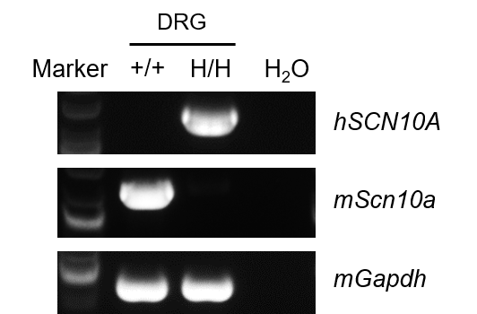 Strain specific analysis of SCN10A mRNA expression in wild-type C57BL/6JNifdc mice and homozygous B-hSCN10A mice by RT-PCR. Dorsal root ganglia (DRG) RNA were isolated from wild-type C57BL/6JNifdc mice (+/+) and homozygous B-hSCN10A mice (H/H), then cDNA libraries were synthesized by reverse transcription, followed by PCR with mouse or human SCN10A primers. Mouse Scn10a mRNA was detectable in wild-type C57BL/6JNifdc mice and homozygous B-hSCN10A mice. Human SCN10A mRNA was detectable only in homozygous B-hSCN10A mice but not in wild-type mice.