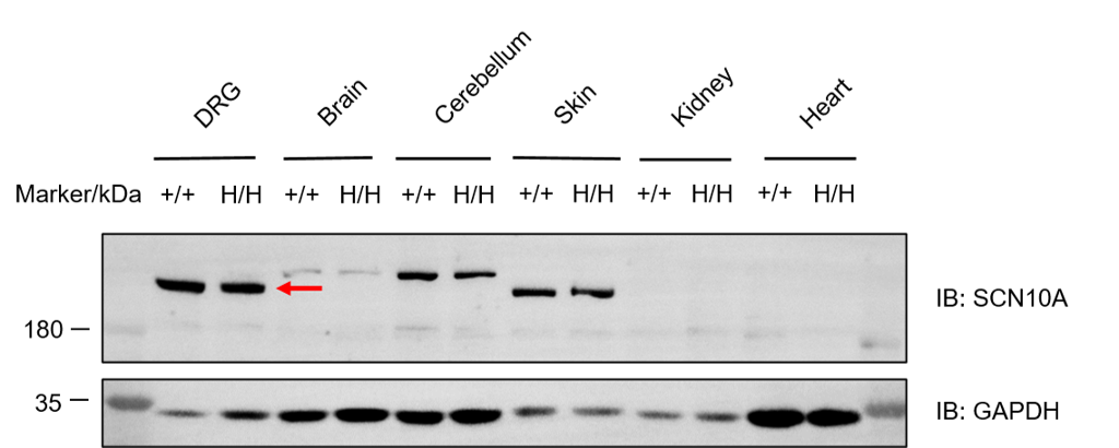 Western blot analysis of SCN10A protein expression in homozygous B-hSCN10A mice. Various tissue lysates were collected from wild-type C57BL/6 mice (+/+) and homozygous B-hSCN10A mice (H/H), and then analyzed by western blot with anti-hSCN10A antibody (Alomone, ASC-028). 40 μg total proteins were loaded for western blotting analysis. SCN10A protein was detectable in DRG, brain, cerebellum and skin from homozygous B-hSCN10A mice and wild-type C57BL/6 mice.