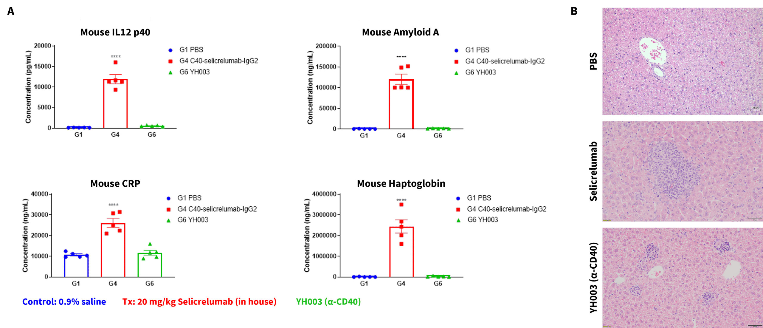 Fig 2. (A) Acute phase proteins such as CRP, amyloid A, haptoglobin and IL12p40 are increased in response to Selicrelumab in B-hCD40 mice. (B) Liver pathology demonstrated the increased lymphocyte infiltration compared with PBS treated mice.
