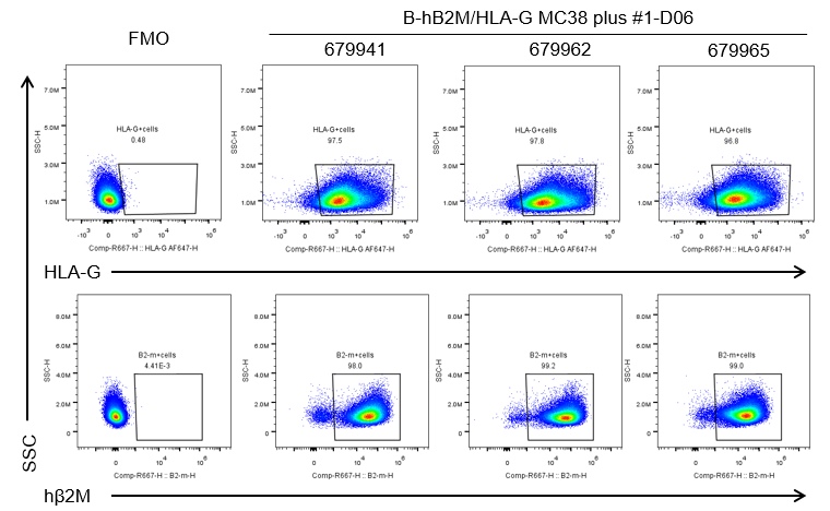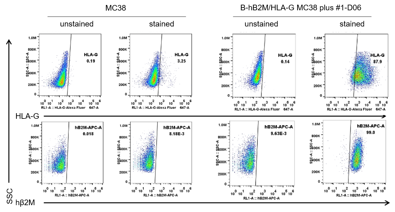 • Gene targeting strategy: The mouse B2m gene was replaced by human B2M and HLA-G coding sequence in B-hB2M/HLA-G MC38 plus. Human HLA-G is highly expressed on the surface of B-hB2M/HLA-G MC38 plus cells.