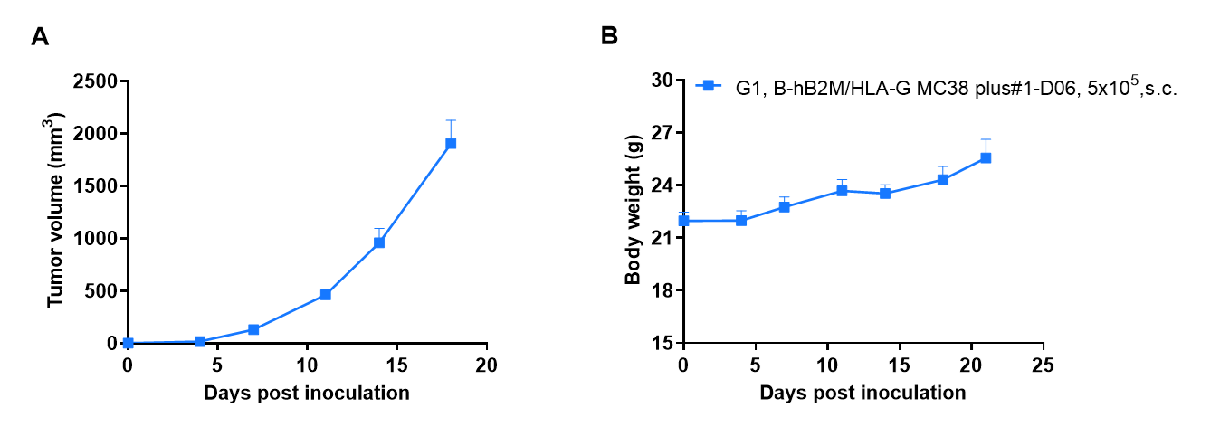 Subcutaneous tumor growth of  B-hB2M/HLA-G MC38 plus.  B-hB2M/HLA-G MC38 plus (5×105) were subcutaneously implanted into B-Tg(hLILRB2/hLILRB3/hLILRB1/hLILRB4),Pirb KO mice (female, 12-week-old, n=6). Tumor volume and body weight were measured twice a week. (A) Average tumor volume. (B) Body weight. Volume was expressed in mm3 using the formula: V=0.5 × long diameter × short diameter2. Results indicate that  B-hB2M/HLA-G MC38 plus were able to establish tumors in vivo and can be used for efficacy studies. Values are expressed as mean ± SEM.