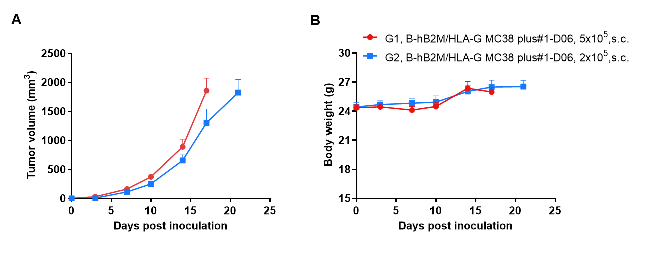 Subcutaneous tumor growth of  B-hB2M/HLA-G MC38 plus. B-hB2M/HLA-G MC38 plus (5×105, 2×105) were subcutaneously implanted into B-Tg(hLILRB2/hLILRB3/hLILRB1/hLILRB4), Pirb KO mice (female, 18-week-old, n=8). Tumor volume and body weight were measured twice a week. (A) Average tumor volume. (B) Body weight. Volume was expressed in mm3 using the formula: V=0.5 × long diameter × short diameter2. Results indicate that  B-hB2M/HLA-G MC38 plus were able to establish tumors in vivo and can be used for efficacy studies. Values are expressed as mean ± SEM.