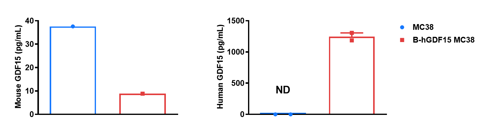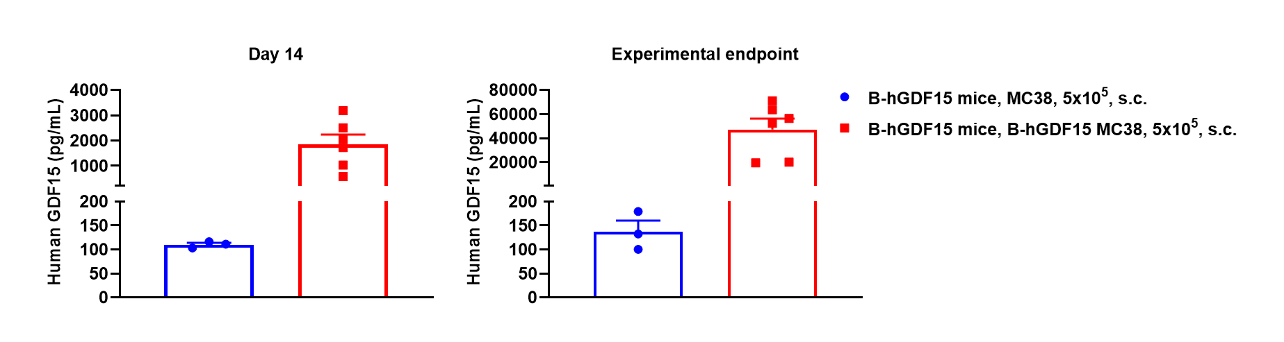 Human GDF15 expression in serum of B-hGDF15 MC38 tumor-bearing mice measured by ELISA. B-hGDF15 MC38 cells were subcutaneously transplanted into homozygous B-hGDF15 mice (n=6). Upon day 14 and endpoint, serum was collected from homozygous B-hGDF15 mice. As shown, human GDF15 was highly expressed in serum from homozygous B-hGDF15 mice bearing subcutaneous B-hGDF15 MC38 tumors. Therefore, B-hGDF15 MC38 cells can be used for in vivo efficacy studies evaluating novel GDF15 therapeutics.