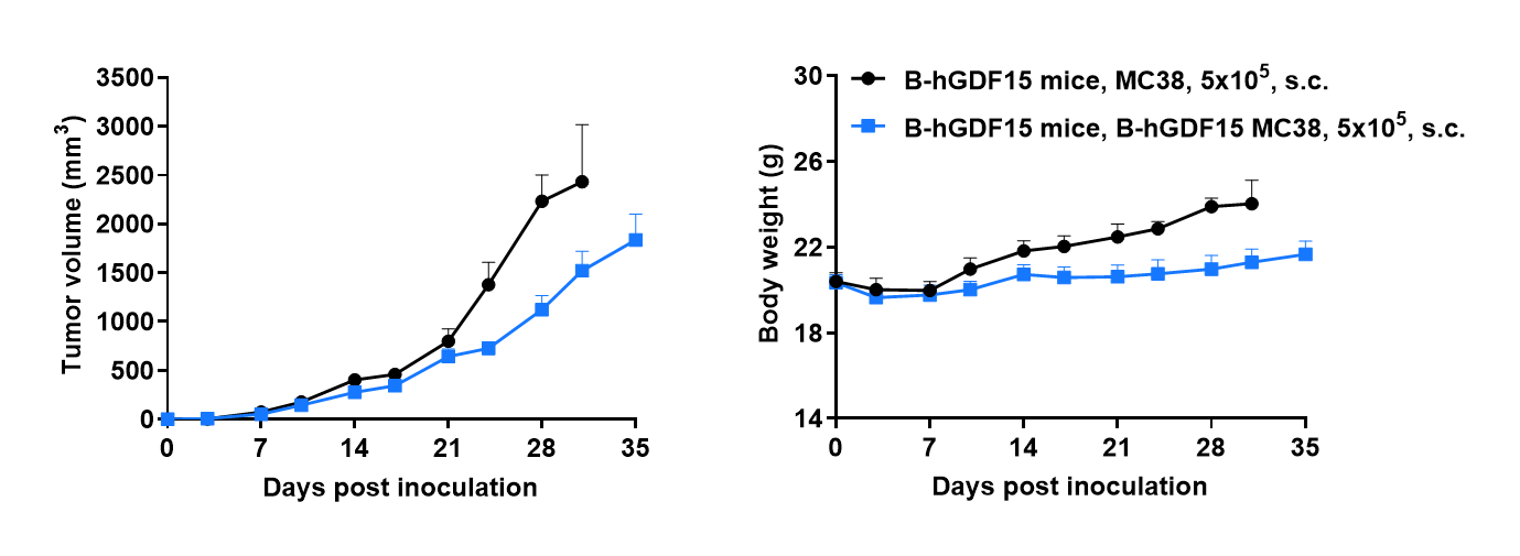 Subcutaneous tumor growth of B-hGDF15 MC38 cells. B-hGDF15 MC38 cells (5x105) and wild-type MC38 cells (5x105) were subcutaneously implanted into homozygous B-hGDF15 mice (female, 6-8 weeks old, n=6). Tumor volume and body weight were measured twice a week. (A) Average tumor volume. (B) Body weight. The B-hGDF15 MC38 cell inoculation group shows a decreasing trend in body weight compared to the wild-type MC38 cell inoculation group. Volume was expressed in mm3 using the formula: V=0.5 X long diameter X short diameter2. Results indicate that B-hGDF15 MC38 cells were able to establish tumors in vivo and can be used for efficacy studies. Values are expressed as mean ± SEM.