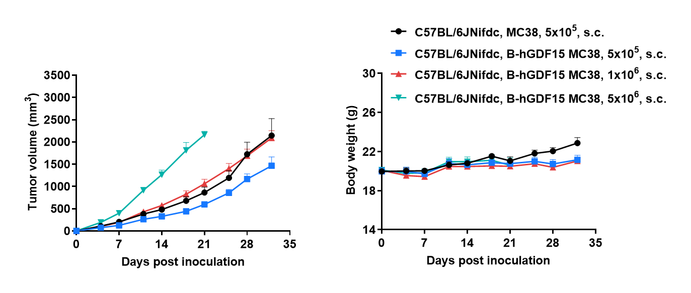 Subcutaneous tumor growth of B-hGDF15 MC38 cells. B-hGDF15 MC38 cells (5x105, 1x106 , 5x106) and wild-type MC38 cells (5x105) were subcutaneously implanted into C57BL/6JNifdc (female, 8 weeks old, n=6). Tumor volume and body weight were measured twice a week. (A) Average tumor volume. (B) Body weight. Volume was expressed in mm3 using the formula: V=0.5 X long diameter X short diameter2. Values are expressed as mean ± SEM.