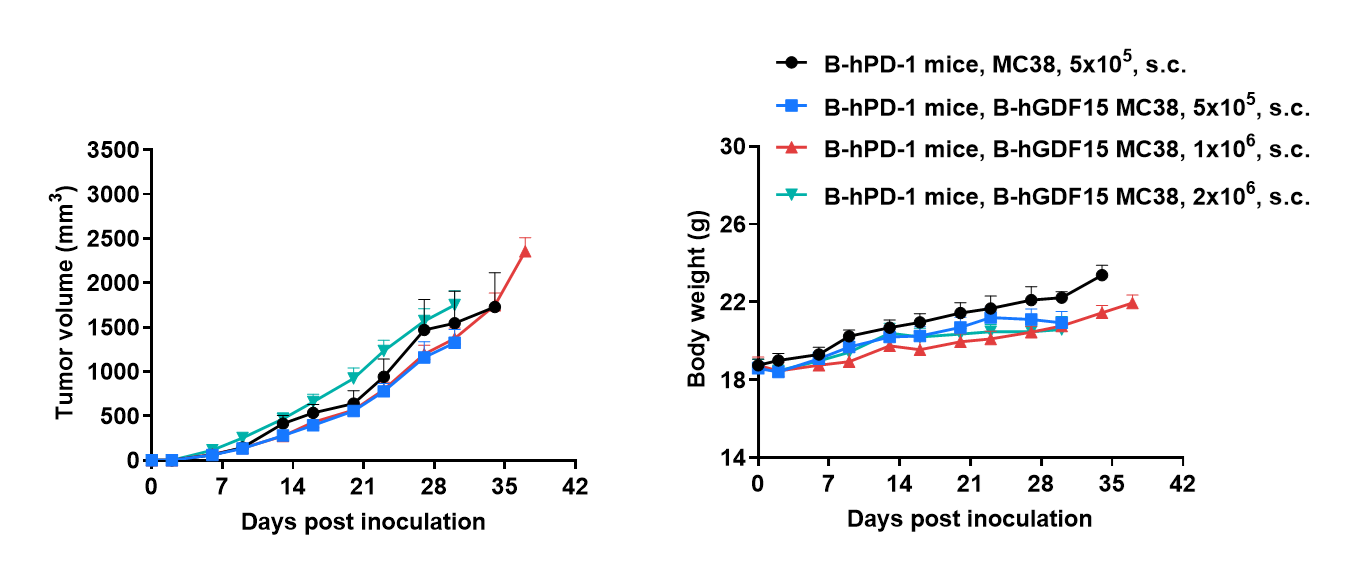 Subcutaneous tumor growth of B-hGDF15 MC38 cells. B-hGDF15 MC38 cells (5x105, 1x106 , 2x106) and wild-type MC38 cells (5x105) were subcutaneously implanted into B-hPD-1 mice (female, 7 weeks old, n=6). Tumor volume and body weight were measured twice a week. (A) Average tumor volume. (B) Body weight. Volume was expressed in mm3 using the formula: V=0.5 X long diameter X short diameter2. Values are expressed as mean ± SEM.