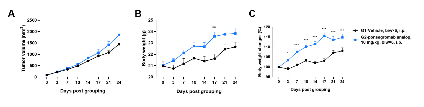 Antitumor activity of anti-human GDF15 antibody (ponsegromab analog, in-house) in B-hGDF15 mice. (A) B-hGDF15 MC38 tumor growth in B-hGDF15 mice. Murine colon cancer B-hGDF15 MC38 cells (5×105) were subcutaneously implanted into homozygous B-hGDF15 mice (female, 9 weeks old, n=6). Mice were grouped when tumor volume reached approximately 100-150 mm3, at which time they were intraperitoneally injected with anti-human GDF15 antibody indicated in panel. (B) Body weight changes during treatment. (C) The weight change of each mouse in the group compared to Day 0. As shown in panel B and C, anti-human GDF15 antibody was effective in controlling the weight loss induced by B-hGDF15 MC38 in B-hGDF15 mice, demonstrating that the B-hGDF15 mice and B-hGDF15 MC38 provide a powerful preclinical model for in vivo evaluation of anti-human GDF15 antibodies. Values are expressed as mean ± SEM. Significance was determined by two-way ANOVA test. *P < 0.05, **P < 0.01, ***P < 0.001.