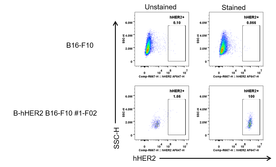 HER2 expression analysis in B-hHER2 B16-F10 #1-F02 by flow cytometry. Single cell suspensions from wild-type B16-F10 and B-hHER2 B16-F10 #1-F02 cultures were stained with human HER2 Antibody (Pertuzumab, in house). Human HER2 was detected on the surface of B-hHER2 B16-F10 #1-F02 cells, but not on the surface of wild-type B16-F10 cells. The clones of B-hHER2 B16-F10 #1-F02 cell was used for in vivo tumor growth assays.