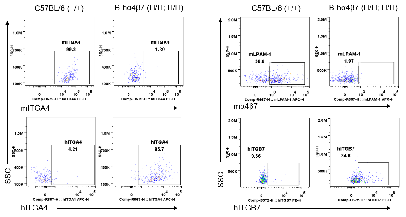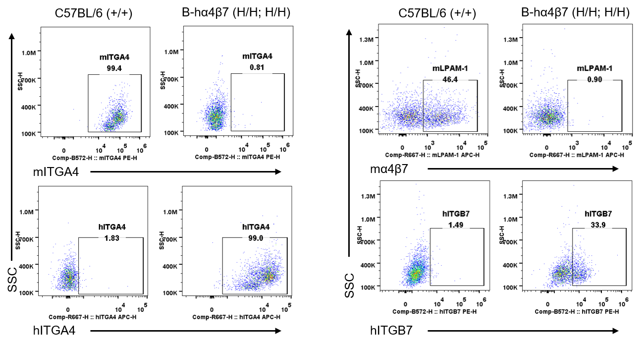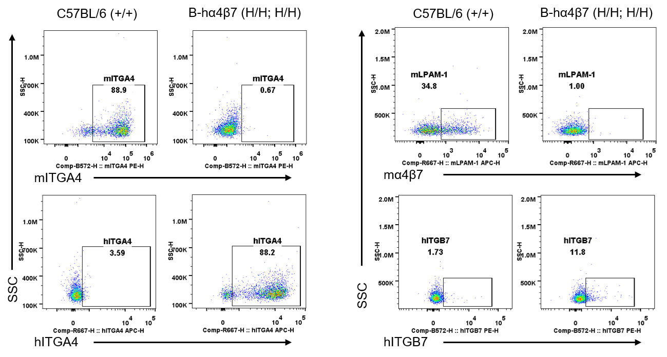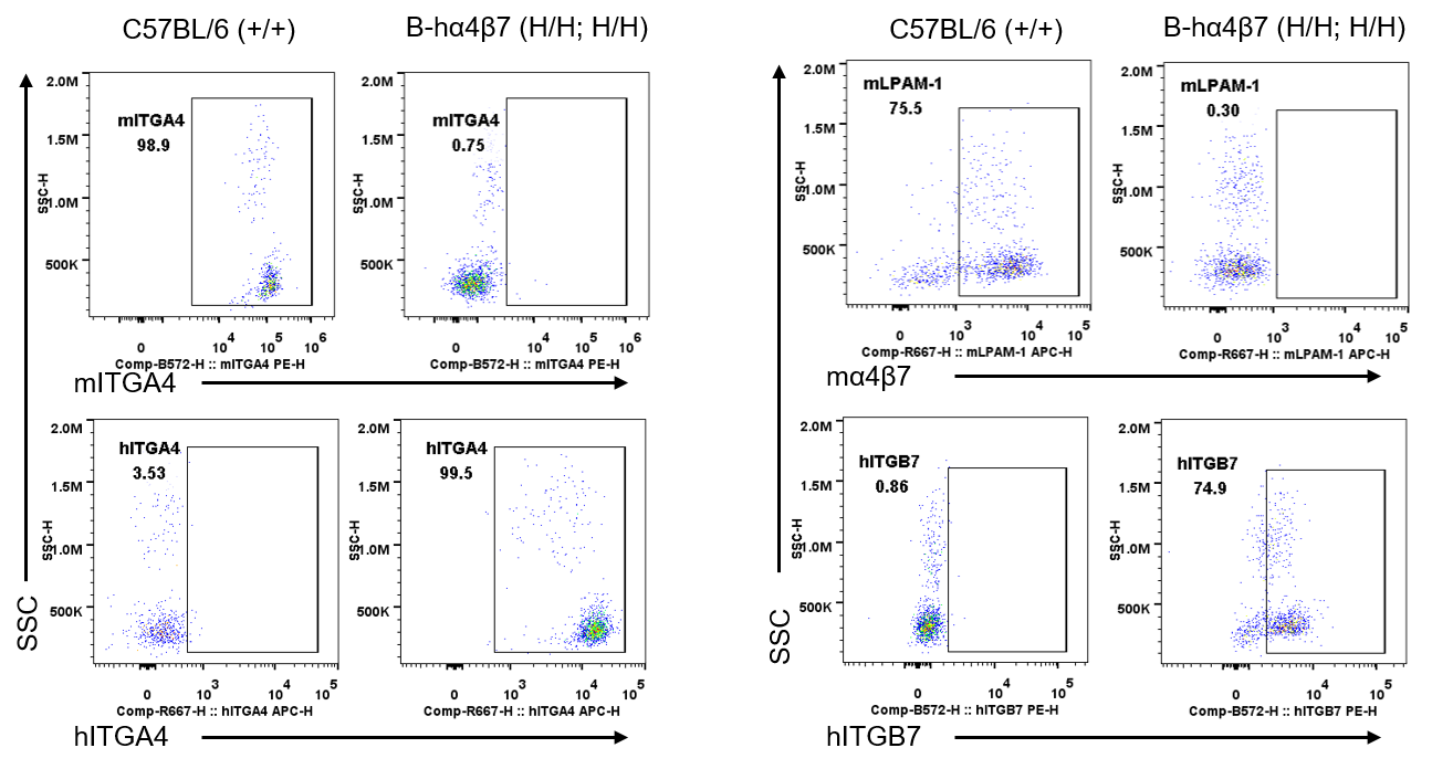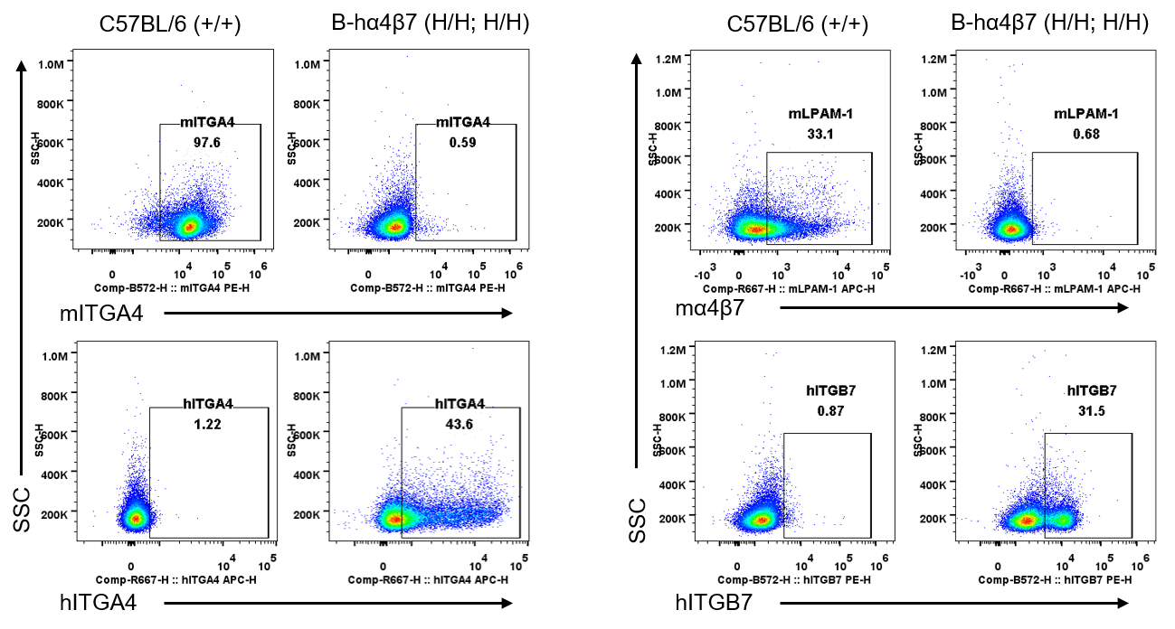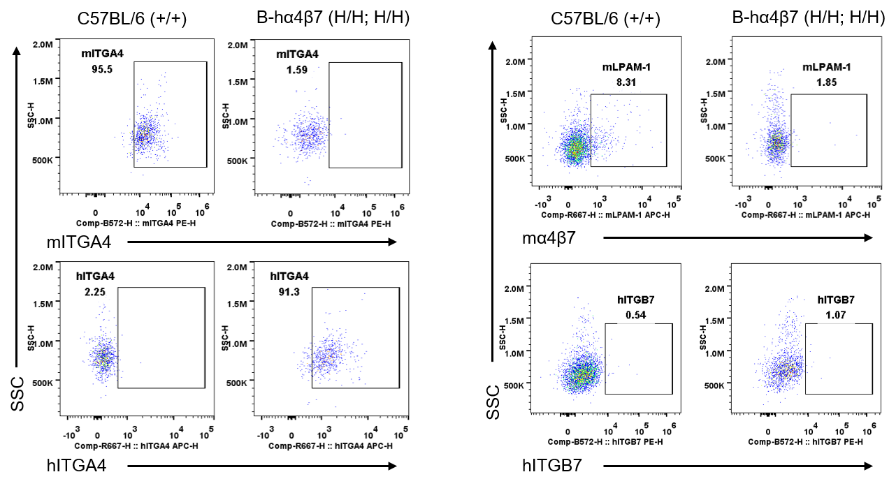 Strain specific ITGA4 and ITGB7 expression analysis in wild-type C57BL/6 mice and homozygous humanized B-hα4β7 mice by flow cytometry. Splenocytes were collected from wild-type C57BL/6 mice (+/+) and homozygous B-hα4β7 mice (H/H;H/H). Protein expression was analyzed with anti-mouse ITGA4 antibody (Biolegend, 103705), anti-mouse LPAM-1/α4β7 antibody (Biolegend, 120607), anti-human ITGA4 antibody (Biolegend, 304307) anti-human ITGB7 antibody (Invitrogen, MA5-23541) by flow cytometry. Mouse ITGA4 and ITGB7 were only detectable in wild-type C57BL/6 mice. Human ITGA4 was exclusively detectable in homozygous B-hα4β7 mice, but not in wild-type C57BL/6 mice.