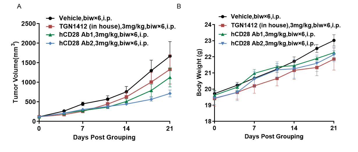 Based on prior experience, for evaluating the efficacy of CD28+TAA antibody drugs, we recommend using hCD28+hTAA humanized mice implanted with hTAA MC38/B16F10 cell lines.
