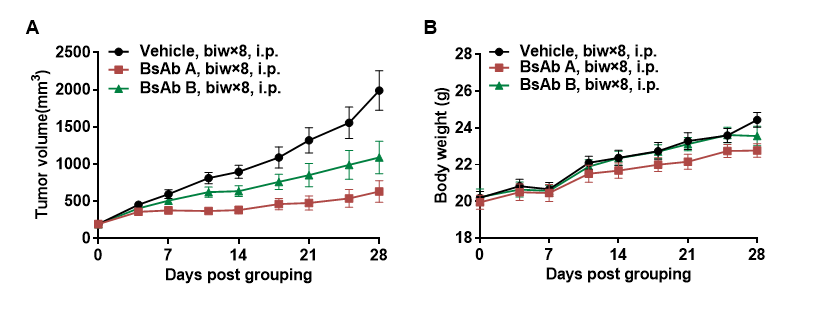 Murine colon cancer B-hPD-L1 MC38 plus cells were subcutaneously implanted into homozygous B-hCD28 mice (female, 7-8 week-old, n=10). Mice were grouped when tumor volume reached approximately 200 mm3, at which time they were treated with anti-human PD-L1xCD28 BsAbs provided by the client. (A) anti-human PD-L1xCD28 BsAbs inhibited B-hPD-L1 MC38 plus cells tumor growth in B-hCD28 mice. (B) Body weight changes during treatment. As shown in panel A, anti-human PD-L1xCD28 BsAbs were efficacious in controlling tumor growth in B-hCD28 mice, demonstrating that the B-hCD28 mice provide a powerful preclinical model for in vivo evaluation of anti-human PD-L1xCD28 BsAbs. Values are expressed as mean ± SEM.