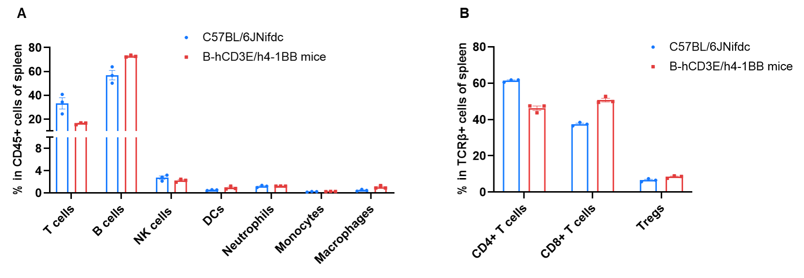 Frequency of leukocyte subpopulations in spleen by flow cytometry. Splenocytes were isolated from wild-type C57BL/6JNifdc mice and homozygous B-hCD3E/h4-1BB mice (female, n=3, 8-week-old). A. Flow cytometry analysis of the splenocytes was performed to assess the frequency of leukocyte subpopulations. B. Frequency of T cell subpopulations. Frequencies of T cells, B cells, NK cells, dendritic cells, neutrophils, monocytes, macrophages, CD4+ T cells, CD8+ T cells and Tregs in B-hCD3E/h4-1BB mice were similar to those in C57BL/6JNifdc. The frequency of leukocyte subpopulations in blood and lymph nodes of B-hCD3E/h4-1BB mice were also comparable to wild-type C57BL/6JNifdc (Data not shown).