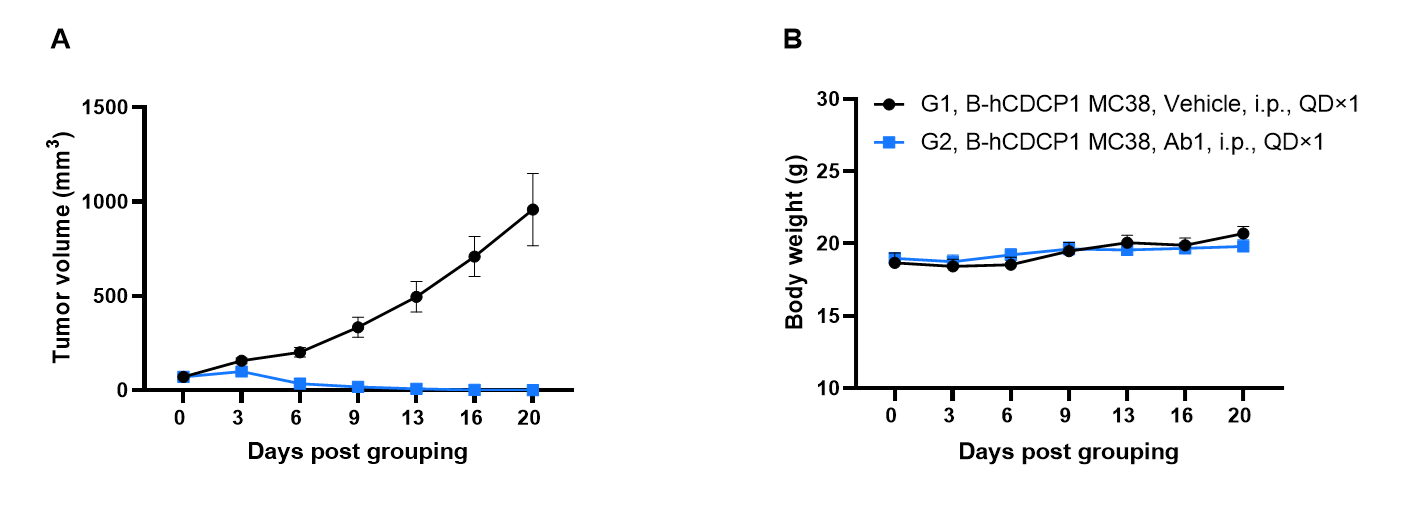 Antitumor activity of Ab1 in B-hCD3E/h4-1BB mice. B-hCDCP1 MC38 tumor cells (1×106) were subcutaneously implanted into female homozygous B-hCD3E/h4-1BB mice (6-week-old, n=5). Mice were grouped when tumor volume reached approximately 80 mm³ and treated with antibody Ab1 provided by the client. (A) Tumor volume changes during treatment. (B) Body weight changes during treatment. Antibody Ab1 effectively inhibited tumor growth in B-hCD3E/h4-1BB mice, demonstrating that this model is a powerful tool for the in vivo efficacy evaluation of antibodies. Values are expressed as mean ± SEM.