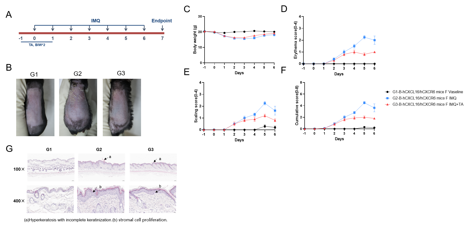 IMQ-induced skin inflammation in B-hCXCL16/hCXCR6 mice phenotypically resembles psoriasis. (A) Experimental schedule for induction of psoriasis-like skin lesions in B-hCXCL16/hCXCR6 mice. B-hCXCL16/hCXCR6 mice (Female, 8 week-old, n=5) were scored daily for up to 6 days for body weight and clinical signs of skin inflammation following treatment with imiquimod (IMQ) cream, Control mice were treated similarly with Vaseline cream. Mice in group 3 were treated with the monoclonal antibody TA targeting human CXCR6(Provided by the client). (B) Phenotypical presentation of mouse back skin after 6 days of treatment. (C) Body weight changes during treatment. (D-E) Erythema and scaling score of the back was scored daily on a scale from 0 to 4. Additionally, the cumulative score (F) (erythema plus scaling) is depicted. (G)H&E staining of the back skin of mice. Values are expressed as mean ± SEM.
