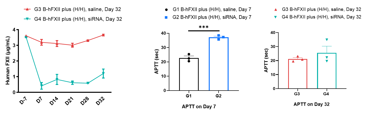 • In vivo efficacy: FXII-targeted small nucleic acid drugs (synthesized according to patents) were efficacious in B-hFXII mice plus. This strain can be used to screen for the knockdown of the expression level of small nucleic acid drugs.