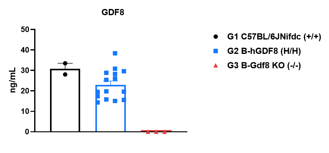Strain specific GDF8 expression analysis in homozygous B-hGDF8 mice by ELISA. Plasma was collected from wild-type C57BL/6JNifdc mice (+/+) and homozygous B-hGDF8 mice (H/H) (male, 6-week-old), and analyzed by ELISA. Human and mouse GDF8 proteins were both detectable in wild-type C57BL/6JNifdc and B-hGDF8 mice, but not in B-Gdf8 KO mice. The ELISA kit cross-recognizes human and mouse GDF8.