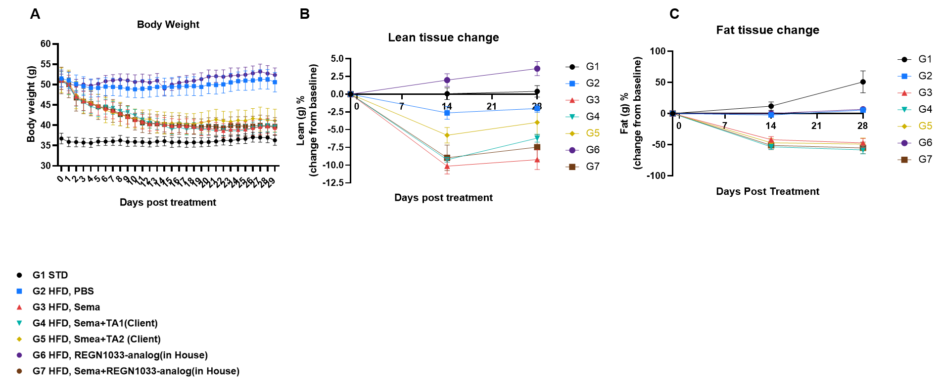In Vivo Efficacy Study in HFD-Induced B-hGDF8 mice. B-hGDF8 mice were fed with a high-fat diet for 14 weeks to induce obesity. (A) Body weight change after treatment. (B) Lean tissue changes from Day-1 analyzed by the body composition analyzer. (C) Fat tissue changes from Day-1 analyzed by the body composition analyzer. Myostatin monoclonal blocking antibody promoted lean tissue growth, and in combination with semaglutide, it prevented semaglutide-induced lean tissue loss. Values are expressed as mean ± SEM.