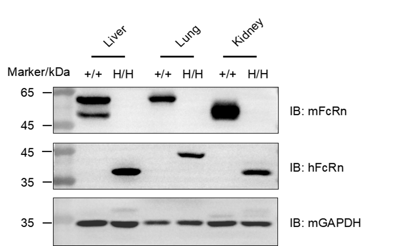 Western blot analysis of FcRn protein expression in homozygous B-hHGF/hMET/hFcRn mice. Various tissue lysates were collected from wild-type C57BL/6JNifdc mice (+/+) and homozygous B-hHGF/hMET/hFcRn mice (H/H), and then analyzed by western blot with species-specific anti-FcRn antibody(anti-mouse FcRn antibody: R&D, AF6775; anti-human FcRn antibody: Novus Biologicals, NBP1-89128). 40 μg total proteins were loaded for western blotting analysis. Mouse FcRn was only detectable in wild-type C57BL/6JNifdc mice, but not in homozygous B-hHGF/hMET/hFcRn mice. Human FcRn was exclusively detectable in homozygous B-hHGF/hMET/hFcRn mice.