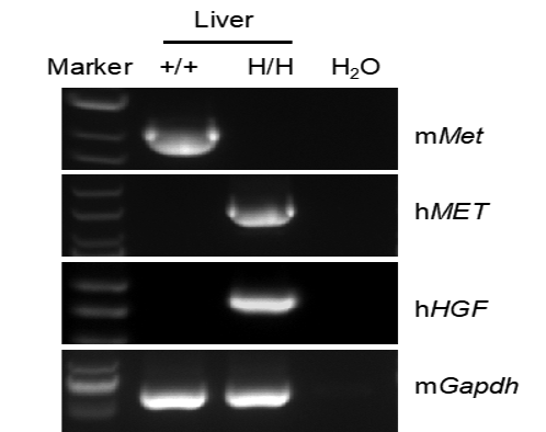 Strain specific analysis of HGF and MET mRNA expression in wild-type C57BL/6JNifdc mice and B-hHGF/hMET/hFcRn mice by RT-PCR. Liver RNA were isolated from wild-type C57BL/6JNifdc (+/+) and homozygous B-hHGF/hMET/hFcRn mice (H/H), then cDNA libraries were synthesized by reverse transcriptio, followed by PCR with mouse or human HGF and MET primers. Mouse Met mRNA was detectable only in wild-type C57BL/6JNifdc mice. Human HGF and MET mRNA was detectable only in homozygous B-hHGF/hMET/hFcRn mice but not in wild-type mice.