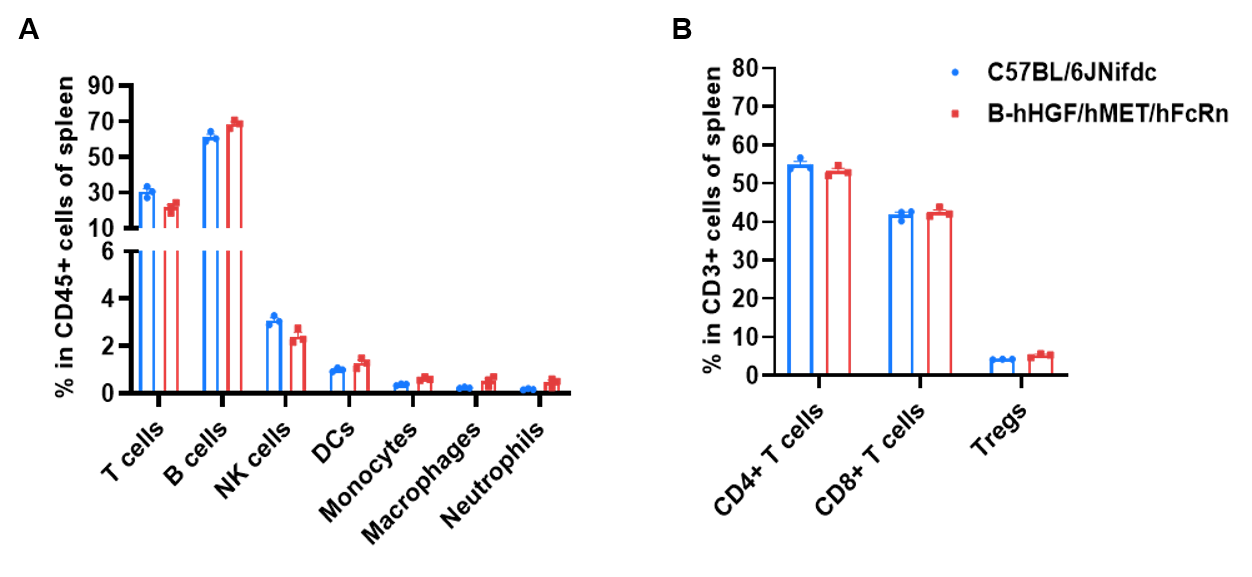 Frequency of leukocyte subpopulations in spleen by flow cytometry. Splenocytes were isolated from wild-type C57BL/6JNifdc mice (female, 9-week-old, n=3) and homozygous B-hHGF/hMET/hFcRn mice (female,10-week-old, n=3). A. Flow cytometry analysis of the splenocytes was performed to assess the frequency of leukocyte subpopulations. B. Frequency of T cell subpopulations. Frequencies of T cells, B cells, NK cells, DCs, monocytes, macrophages, neutrophils, CD4+ T cells, CD8+ T cells and Tregs in B-hHGF/hMET/hFcRn mice were similar to those in C57BL/6JNifdc mice, demonstrating that humanization of HGF, MET and FcRn does not change the frequency or distribution of these cell types in spleen. The frequency of leukocyte subpopulations in blood and lymph node of B-hHGF/hMET/hFcRn mice were also comparable to wild-type C57BL/6JNifdc mice (Data not shown). Values are expressed as mean ± SEM.