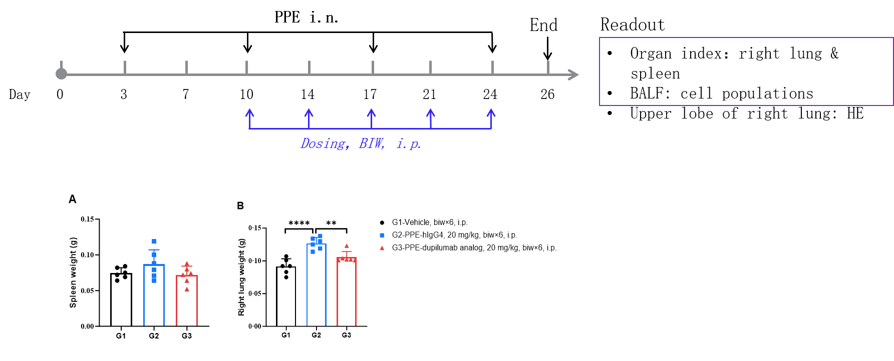 Experimental schedule for Induction of COPD and in vivo efficacy of anti-human IL4RA antibody in B-hIL4/hIL4RA mice. B-hIL4/hIL4RA mice (female, 6-8-week-old, n=6) were immunized with PPE to induce COPD. Anti-human IL4RA antibody dupilumab analog (in-house) was administered by intraperitoneal injection (n=6). COPD: Chronic Obstructive Pulmonary Disease. PPE: porcine pancreatic elastase. A. Spleen weight, B. Right lung weight. After treatment of dupilumab (in house), the right lung weight was much lower than the positive control in homozygous B-hIL4/hIL4RA mice.