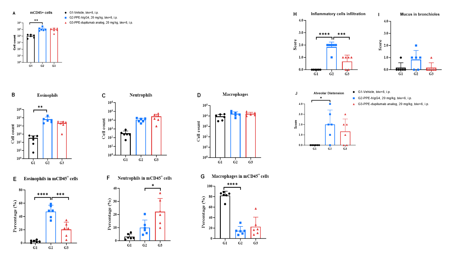 Efficacy Evaluation of the anti-human IL4RA (dupilumab) (in house) in HDM-induced Asthma Model of B-hIL4/hIL4RA mice. (A) The number of CD45+ cells in BALF. (B) The number of eosinophils in BALF. (C) The proportion of eosinophils to CD45+ cells. The results showed that after challenge with HDM, the leukocyte infiltration of mice in G4 model group was significantly increased compared with G3 control group, and their eosinophil content was significantly increased, suggesting that the model was successfully established. After administration of 25 mg/kg dupilumab (in house), the numbers of CD45+ cells and eosinophils were significantly lower compared with the G3 model group. (D) Serum was taken at the end of the experiment and total IgE levels were measured. The results showed that the levels of total IgE in G4 model group were significantly increased compared with G3 control group, suggesting successful modeling. Total IgE levels were significantly lower after administration of dupilumab (in house) drug compared with the G4 model group.