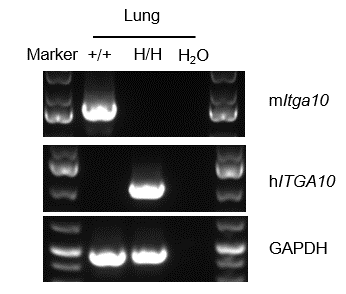 Strain specific analysis of ITGA10 mRNA expression in wild-type C57BL/6JNifdc mice and B-hITGA10 mice by RT-PCR. Lung mRNA were isolated from wild-type C57BL/6JNifdc mice (+/+) and homozygous B-hITGA10 mice (H/H), then cDNA libraries were synthesized by reverse transcription, followed by PCR with mouse or human ITGA10 primers. Mouse Itga10 was detectable only in wild-type mice. Human ITGA10 mRNA was detectable only in homozygous B-hITGA10 mice but not in wild-type mice.