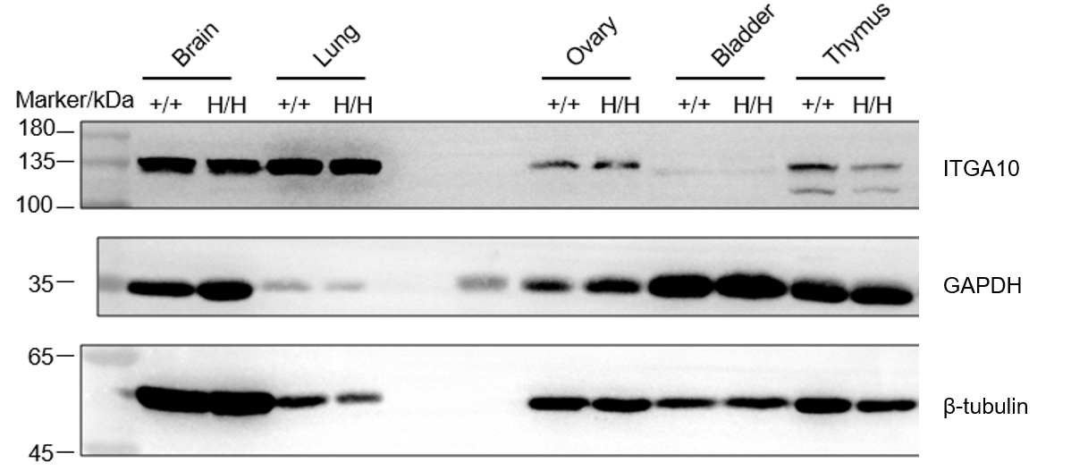 Western blot analysis of ITGA10 protein expression in homozygous B-hITGA10 mice. Various tissue lysates were collected from wild-type C57BL/6JNifdc mice (+/+) and homozygous B-hITGA10 mice (H/H), and then analyzed by western blot with anti-ITGA10 antibody antibody (Thermo Fisher, PA5-67829 , cross-reactive between human and mouse).