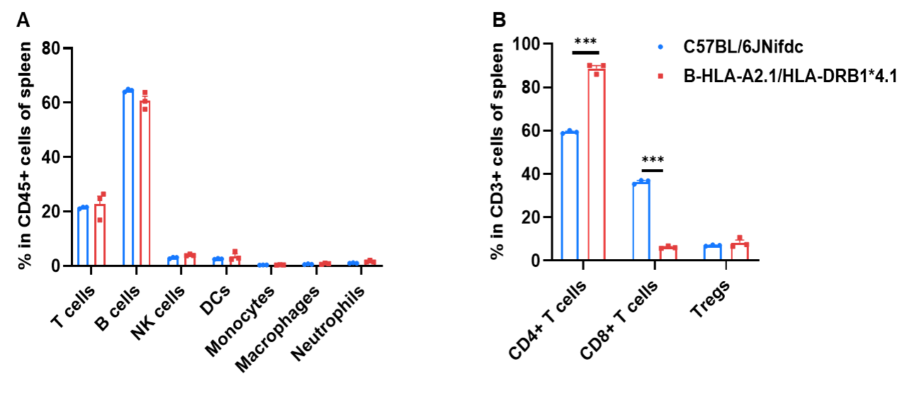 Frequency of leukocyte subpopulations in spleen by flow cytometry. Splenocytes were isolated from wild-type C57BL/6JNifdc mice and homozygous B-HLA-A2.1/HLA-DRB1*4.1 mice (female, 10-week-old, n=3). A. Flow cytometry analysis of the splenocytes was performed to assess the frequency of leukocyte subpopulations. B. Frequency of T cell subpopulations. Frequencies of T cells, B cells, NK cells, dendritic cells, monocytes, macrophages, neutrophils and Tregs in B-HLA-A2.1/HLA-DRB1*4.1 mice were similar to those in C57BL/6JNifdc mice. The frequency of CD8+ T cells in B-HLA-A2.1/HLA-DRB1*4.1 mice were lower than that in C57BL/6JNifdc mice, whereas the frequency of CD4+ T cells in B-HLA-A2.1/HLA-DRB1*4.1 mice were higher than that in C57BL/6JNifdc mice. Values are expressed as mean ± SEM. Significance was determined by two-way ANOVA test.  *P < 0.05, **P < 0.01, ***p < 0.001.