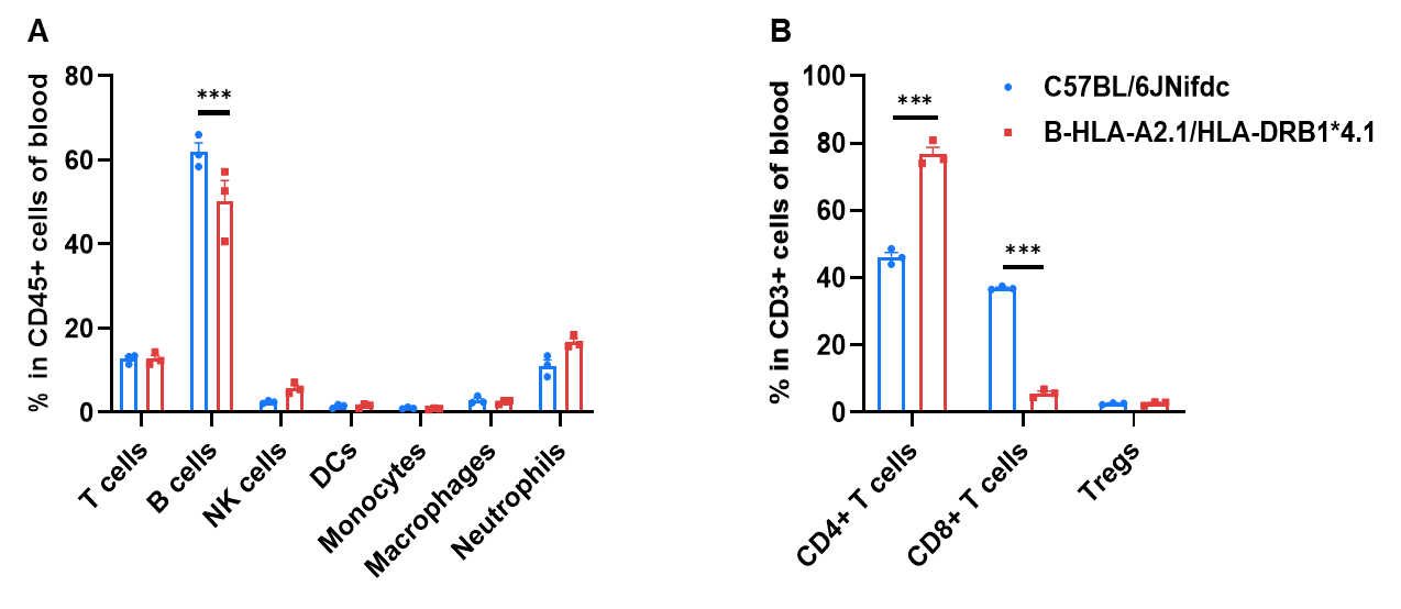 Frequency of leukocyte subpopulations in blood by flow cytometry. Blood were isolated from wild-type C57BL/6JNifdc mice and homozygous B-HLA-A2.1/HLA-DRB1*4.1 mice (female, 10-week-old, n=3). A. Flow cytometry analysis of the blood was performed to assess the frequency of leukocyte subpopulations. B. Frequency of T cell subpopulations. Frequencies of T cells, NK cells, dendritic cells, monocytes, macrophages, neutrophils, and Tregs in B-HLA-A2.1/HLA-DRB1*4.1 mice were similar to those in C57BL/6JNifdc mice. The frequency of B cells in B-HLA-A2.1/HLA-DRB1*4.1 mice were lower than that in C57BL/6JNifdc mice. The frequency of CD8+ T cells in B-HLA-A2.1/HLA-DRB1*4.1 mice were lower than that in C57BL/6JNifdc mice, whereas the frequency of CD4+ T cells in B-HLA-A2.1/HLA-DRB1*4.1 mice were higher than that in C57BL/6JNifdc mice. Values are expressed as mean ± SEM. Significance was determined by two-way ANOVA test.  *P < 0.05, **P < 0.01, ***p < 0.001.