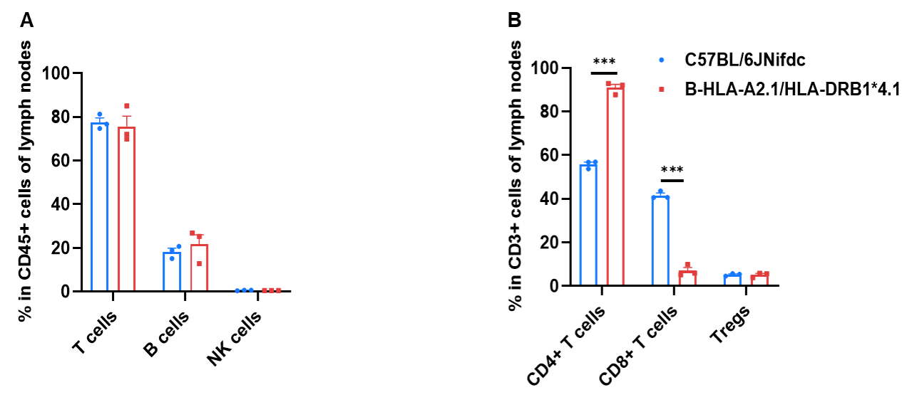 Frequency of leukocyte subpopulations in lymph node by flow cytometry. Lymph node cells were isolated from wild-type C57BL/6JNifdc mice and homozygous B-HLA-A2.1/HLA-DRB1*4.1 mice (female, 10-week-old, n=3). A. Flow cytometry analysis of the lymph node was performed to assess the frequency of leukocyte subpopulations. B. Frequency of T cell subpopulations. Frequencies of NK cells, and Tregs in B-HLA-A2.1/HLA-DRB1*4.1 mice were similar to those in C57BL/6JNifdc mice. The frequency of T cells in B-HLA-A2.1/HLA-DRB1*4.1 mice were higher than that in C57BL/6JNifdc mice. The frequency of CD8+ T cells in B-HLA-A2.1/HLA-DRB1*4.1 mice were lower than that in C57BL/6JNifdc mice, whereas the frequency of CD4+ T cells in B-HLA-A2.1/HLA-DRB1*4.1 mice were higher than that in C57BL/6JNifdc mice. Values are expressed as mean ± SEM. Significance was determined by two-way ANOVA test.  *P < 0.05, **P < 0.01, ***p < 0.001.