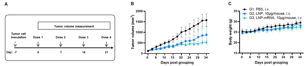 Antitumor activity of NY-ESO-1 mRNA vaccine against syngeneic tumors. (A) Experimental scheme. (B) Antitumor activity of therapeutic treatment with mRNA vaccine. B-HLA-A2.1/HLA-DRB1*4.1 mice (n = 6/group) were vaccinated with PBS, LNP or LNP-mRNA. B-HLA-A2.1/HLA-DRB1*4.1 mice were implanted subcutaneously with 1×106 B-HLA-A2.1/hNY-ESO-1 MC38 tumor cells in the right flank and immunized four times at 1-week intervals with PBS, LNP or mRNA vaccines via intravenous (i.v.) injection on days 0, 7, 14 and 21 after tumor volume reached approximately 100 mm3. As shown in panel B, the mRNA vaccines demonstrated inhibition of tumor growth and significantly prolonged overall survival compared to the control group. C. Body weight changes during tumor growth observation. These results demonstrate that B-HLA-A2.1/HLA-DRB1*4.1 mice provide a powerful preclinical model for in vivo evaluation of mRNA vaccines. Values are expressed as mean ± SEM.