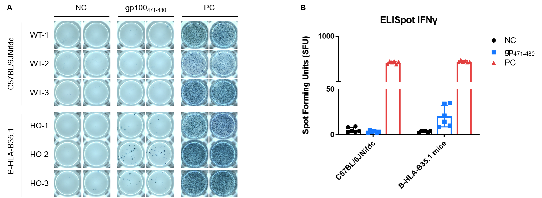 Detection of vaccine-induced immune responses in B-HLA-B35.1 mice by IFN-γ ELISpot assay. Female C57BL/6JNifdc mice and B-HLA-B35.1 mice at the age of 16 weeks were divided into PBS group and gp471-480 group (n = 3), and then immunized with PBS or the peptide at the inside muscle of both legs twice. One week after the last immunization, mice were sacrificed. The splenocytes were collected, and respectively stimulated with the peptide, PBS as negative control (NC) and PMA/Ionomycin (R&D, 423302) as positive control (PC). IFN-γ secretion was measured 20 hours after the stimulation. There was no significant difference in the body weight among the groups (Data was not shown). (A) Representative results of IFN-γ secretion. (B) Summary of results. The results demonstrate that B-HLA-B35.1 mice provide a powerful preclinical model for in vivo evaluation of vaccines. NC: negative control, PC: positive control.