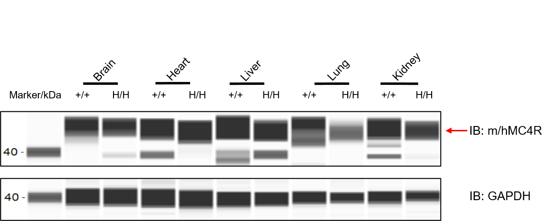Western blot analysis of MC4R protein expression in homozygous B-hMC4R mice. Various tissue lysates were collected from wild-type C57BL/6N mice (+/+) and homozygous B-hMC4R mice (H/H), and then analyzed by protein simple-western blot with anti-MC4R antibody. 3 μg total proteins were loaded for western blotting analysis. MC4R protein was detected in the brain,kidney,spleen,heart and liver of wild-type C57BL/6N mice and homozygous B-MC4R mice, as the antibody is cross-recognize both human and mouse MC4R.