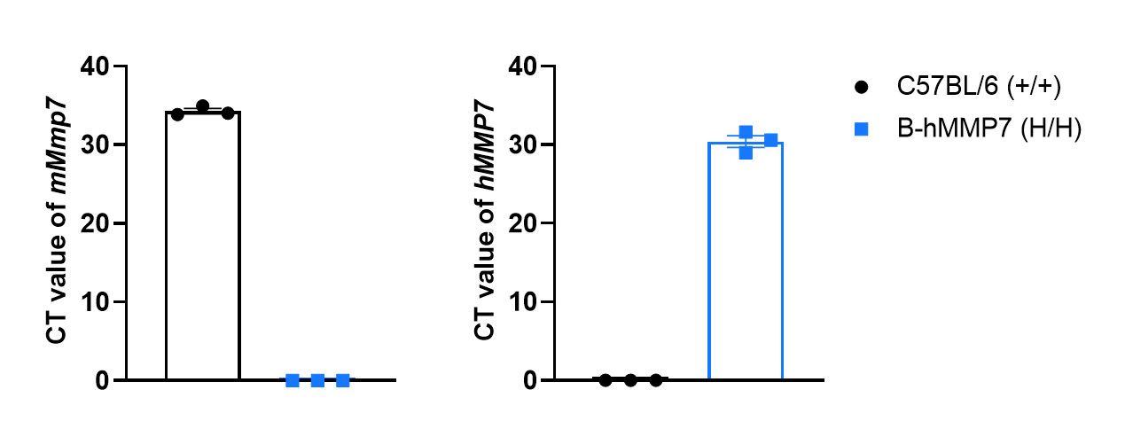Strain specific analysis of MMP7 gene expression in wild-type C57BL/6 mice and hMMP7 mice by RT-qPCR. Lung RNA were isolated from wild-type C57BL/6 mice (+/+) (n=3, male, 9-week-old) and homozygous B-hMMP7 mice (H/H) (n=3, male, 9-week-old) , then 40 ng total RNA was used for cDNA library synthesis by reverse transcription, followed by real-time quantitative PCR with MMP7 primers. Mouse Mmp7 was only detected in wild-type C57BL/6 mice and human MMP7 was exclusively detected in homozygous B-hMMP7 mice. CT values of both mouse Mmp7 and human MMP7 were approximately 31 (total cycle: 40). Values are expressed as mean ± SEM.