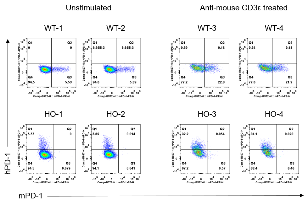 Strain specific PD-1 expression analysis in wild-type (WT) mice and homozygous (HO) B-hPD-1/hPD-L1/hLAG3 plus/hCD8 mice by flow cytometry. Splenocytes were collected from wild-type C57BL/6JNifdc mice and homozygous B-hPD-1/hPD-L1/hLAG3 plus/hCD8 mice after stimulated with or without anti-mouse CD3ε antibody (7.5 μg, i.p.) in vivo for 24 hrs (male, 10-week-old, n=2). Protein expression was analyzed with anti-mouse PD-1 antibody (Biolegend, 109104), anti-human PD-1 antibody (Biolegend, 329908) by flow cytometry. Mouse PD-1 was detectable on T cells in wild-type C57BL/6JNifdc mice. Human PD-1 was only detectable on T cells in homozygous B-hPD-1/hPD-L1/hLAG3 plus/hCD8 mice but not in wild-type C57BL/6JNifdc mice.