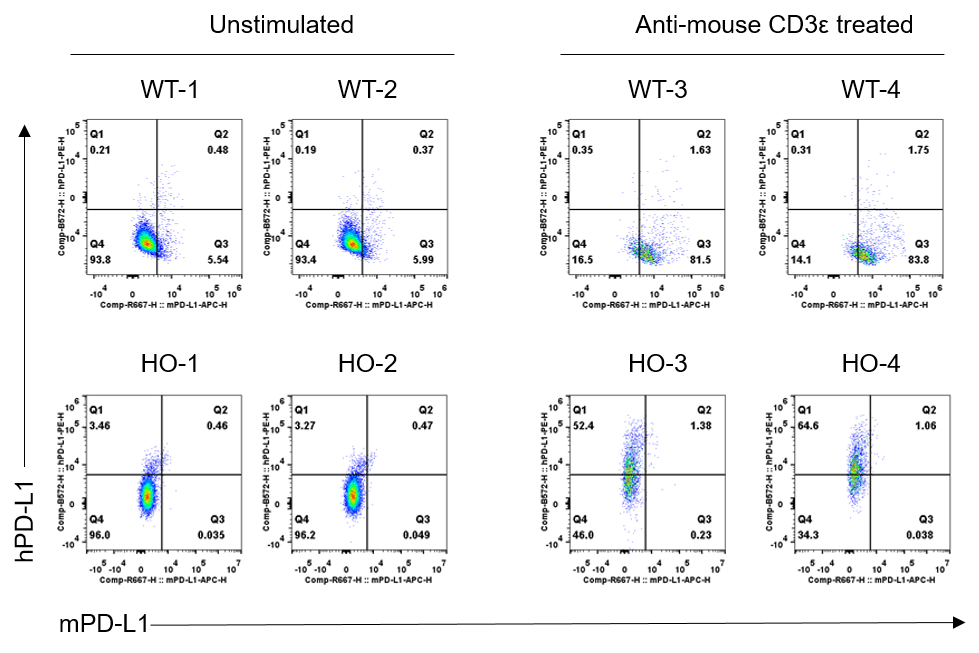 Strain specific PD-L1 expression analysis in wild-type (WT) mice and homozygous (HO) B-hPD-1/hPD-L1/hLAG3 plus/hCD8 mice by flow cytometry. Splenocytes were collected from wild-type C57BL/6JNifdc mice and homozygous B-hPD-1/hPD-L1/hLAG3 plus/hCD8 mice after stimulated with or without anti-mouse CD3ε antibody (7.5 μg, i.p.) in vivo for 24 hrs (male, 10-week-old, n=2). Protein expression was analyzed with anti-mouse PD-L1 antibody (Biolegend, 124312), and anti-human PD-L1 antibody (Biolegend, 329706) by flow cytometry. Mouse PD-L1 was detectable on T cells in wild-type C57BL/6JNifdc mice. Human PD-L1 was only detectable on T cells in homozygous B-hPD-1/hPD-L1/hLAG3 plus/hCD8 mice but not in wild-type C57BL/6JNifdc mice.