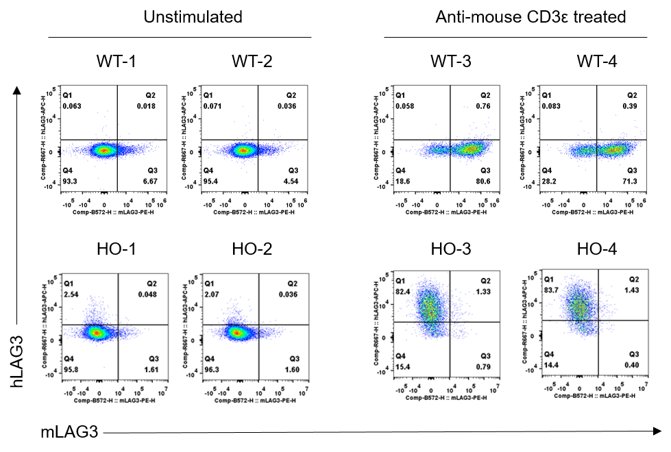 Strain specific LAG3 expression analysis in wild-type (WT) mice and homozygous (HO) B-hPD-1/hPD-L1/hLAG3 plus/hCD8 mice by flow cytometry. Splenocytes were collected from wild-type C57BL/6JNifdc mice and homozygous B-hPD-1/hPD-L1/hLAG3 plus/hCD8 mice after stimulated with or without anti-mouse CD3ε antibody (7.5 μg, i.p.) in vivo for 24 hrs (male, 10-week-old, n=2). Protein expression was analyzed with anti-mouse LAG3 antibody (Biolegend, 125208) and anti-human LAG3 antibody (Biolegend, 369304) by flow cytometry. Mouse LAG3 was detectable on T cells in wild-type C57BL/6JNifdc mice. Human LAG3 was only detectable on T cells in homozygous B-hPD-1/hPD-L1/hLAG3 plus/hCD8 mice but not in wild-type C57BL/6JNifdc mice.