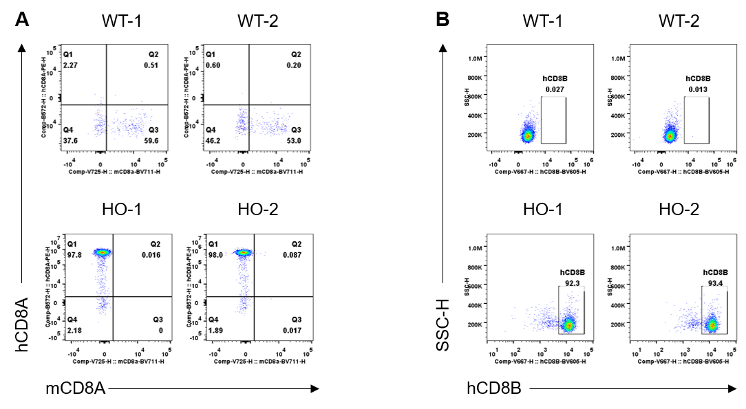Strain specific CD8A and CD8B expression analysis in wild-type (WT) mice and homozygous (HO) B-hPD-1/hPD-L1/hLAG3 plus/hCD8 mice by flow cytometry. Splenocytes were collected from wild-type C57BL/6JNifdc mice and homozygous B-hPD-1/hPD-L1/hLAG3 plus/hCD8 mice (male, 10-week-old, n=2). Protein expression was analyzed with anti-mouse CD8a antibody (Biolegend, 100759), and anti-human CD8a antibody (Biolegend, 300908), and anti-human CD8B antibody (BD, 742392) by flow cytometry. Mouse CD8a was detectable on the CD4- T cells in wild-type C57BL/6JNifdc mice. Human CD8a (A) and CD8B (B) were only detectable on the CD4- T cells in homozygous B-hPD-1/hPD-L1/hLAG3 plus/hCD8 mice but not in wild-type C57BL/6JNifdc mice.
