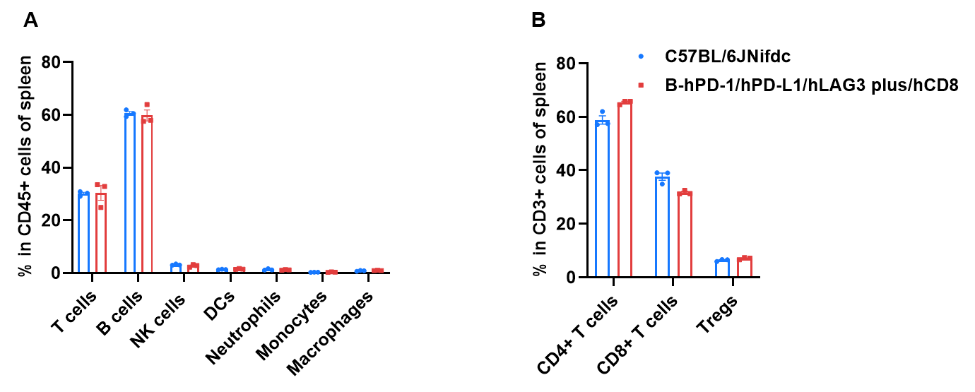 Frequency of leukocyte subpopulations in spleen by flow cytometry. Splenocytes were isolated from wild-type C57BL/6JNifdc mice and homozygous in B-hPD-1/hPD-L1/hLAG3 plus/hCD8 mice (male, 10-week-old, n=3). A. Flow cytometry analysis of the splenocytes was performed to assess the frequency of leukocyte subpopulations. B. Frequency of T cell subpopulations. Frequencies of T cells, B cells, NK cells, dendritic cells, neutrophils, monocytes, macrophages, CD4+ T cells, CD8+ T cells, and Tregs in B-hPD-1/hPD-L1/hLAG3 plus/hCD8 mice were similar to those in C57BL/6JNifdc mice, demonstrating that humanization of PD-1, PD-L1, LAG3, and CD8 does not change the frequency or distribution of these cell types in spleen. The frequency of leukocyte subpopulations in blood and lymph node of B-hPD-1/hPD-L1/hLAG3 plus/hCD8 mice were also comparable to wild-type C57BL/6JNifdc mice (Data not shown).