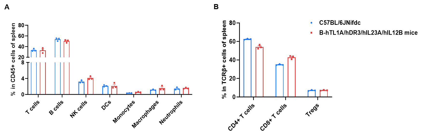 Frequency of leukocyte subpopulations in spleen by flow cytometry. Splenocytes were isolated from wild-type C57BL/6JNifdc mice and homozygous B-hTL1A/hDR3/hIL23A/hIL12B mice (female, 8-week-old, n=3). A. Flow cytometry analysis of the splenocytes was performed to assess the frequency of leukocyte subpopulations. B. Frequency of T cell subpopulations. Frequencies of T cells, B cells, NK cells, dendritic cells (DCs), neutrophils, monocytes, macrophages, CD4+ T cells, CD8+ T cells and Tregs in B-h B-hTL1A/hDR3/hIL23A/hIL12B mice were similar to those in C57BL/6JNifdc mice, demonstrating that humanization of TL1A, DR3, IL23A, and IL12B does not change the frequency or distribution of these cell types in spleen. Values are expressed as mean ± SEM.
