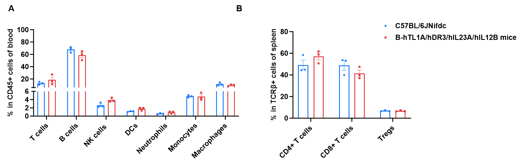 Frequency of leukocyte subpopulations in blood by flow cytometry. Blood cells were isolated from wild-type C57BL/6JNifdc mice (female, n=3, 8-week-old) and homozygous B-hTL1A/hDR3/hIL23A/hIL12B mice (female, n=3, 8-week-old). A. Flow cytometry analysis of the blood cells was performed to assess the frequency of leukocyte subpopulations. B. Frequency of T cell subpopulations. Percentages of T cells, B cells, NK cells, DCs, neutrophils, monocytes, macrophages, CD4+ T cells, CD8+ T cells and Tregs in B-hTL1A/hDR3/hIL23A/hIL12B mice were similar to those in C57BL/6JNifdc mice, demonstrating that humanization of TL1A, DR3, IL23A, and IL12B does not change the frequency or distribution of these cell types in blood. Values are expressed as mean ± SEM.