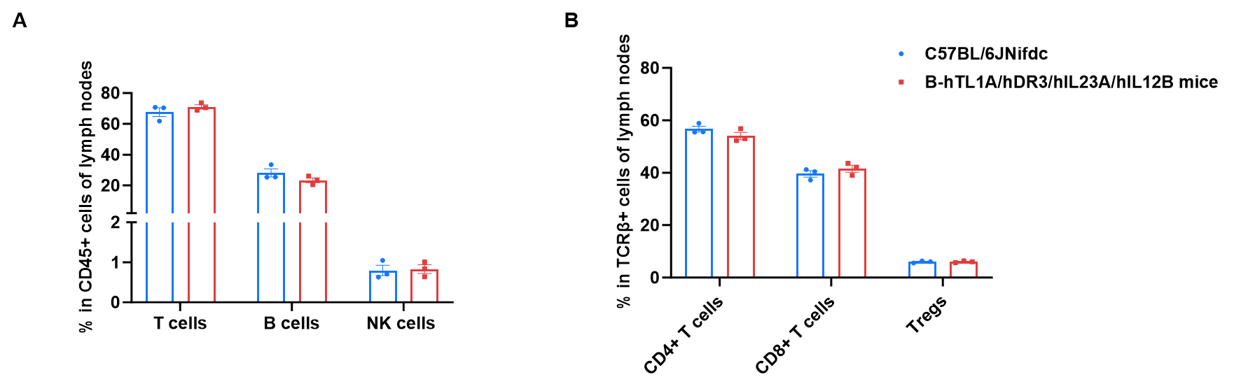 Frequency of leukocyte subpopulations in lymph nodes by flow cytometry. Leukocytes were isolated from wild-type C57BL/6JNifdc mice (female, n=3, 8-week-old) and homozygous B-hTL1A/hDR3/hIL23A/hIL12B mice (female, n=3, 8-week-old). A. Flow cytometry analysis of the lymph nodes cells was performed to assess the frequency of leukocyte subpopulations. B. Frequency of T cell subpopulations. Percentages of T cells, B cells, NK cells, CD4+ T cells, CD8+ T cells and Tregs in B-hTL1A/hDR3/hIL23A/hIL12B mice were similar to those in C57BL/6JNifdc mice, demonstrating that humanization of TL1A, DR3, IL23A, and IL12B does not change the frequency or distribution of these cell types in lymph node. Values are expressed as mean ± SEM.