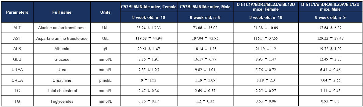 Biochemical test of B-hTL1A/hDR3/hIL23A/hIL12B mice. Values are expressed as mean ± SD.