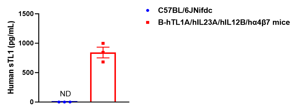 Strain specific TL1 expression analysis in homozygous B-hTL1A/hIL23A/hIL12B/hα4β7 mice by ELISA. Bone marrow-derived dendritic cells were isolated from wild-type C57BL/6JNifdc mice (+/+) and homozygous B-hTL1A/hIL23A/hIL12B/hα4β7 mice (H/H;H/H;H/H;H/H;H/H) (male, 6-week-old, n=3), and stimulated with 1 μg/mL LPS  in vitro for 24 h, then cell supernatants were collected and analyzed by ELISA (anti-human TL1 ELISA kit: R&D, DY1319-05). Human TL1 was exclusively detectable in homozygous B-hTL1A/hIL23A/hIL12B/hα4β7 mice but not in wild-type mice. ND: not detectable.