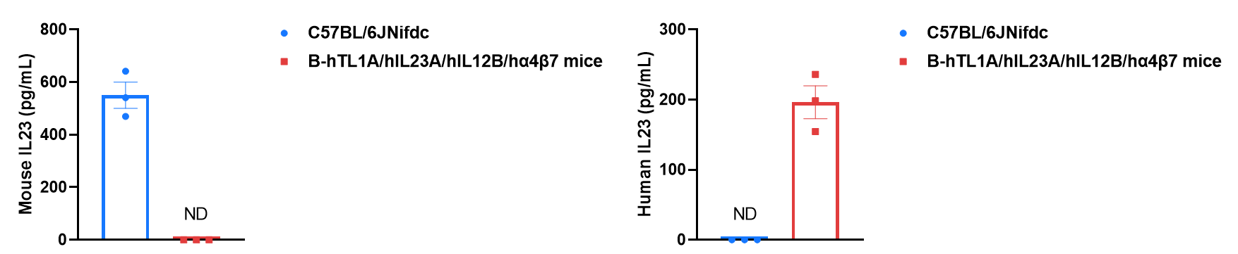 Mouse IL-23 and human IL-23 expression analysis in B-hTL1A/hIL23A/hIL12B/hα4β7 mice by ELISA. Bone marrow derived dendritic cells were produced by culturing the bone marrow from wild-type C57BL/6JNifdc mice (+/+) and homozygous B-hTL1A/hIL23A/hIL12B/hα4β7 mice (H/H;H/H;H/H;H/H;H/H) (male, 6-week-old, n=3), which were stimulated with 1 μg/mL LPS in vitro for 24h. After stimulation, the supernatants were collected and the levels of mouse and human IL23 were analyzed by ELISA (R&D, M2300; R&D, D2300B). Mouse IL23 was only detectable in wild-type C57BL/6JNifdc mice. Human IL23 was exclusively detectable in homozygous B-hTL1A/hIL23A/hIL12B/hα4β7 mice. Values are expressed as mean ± SEM. ND: not detectable.