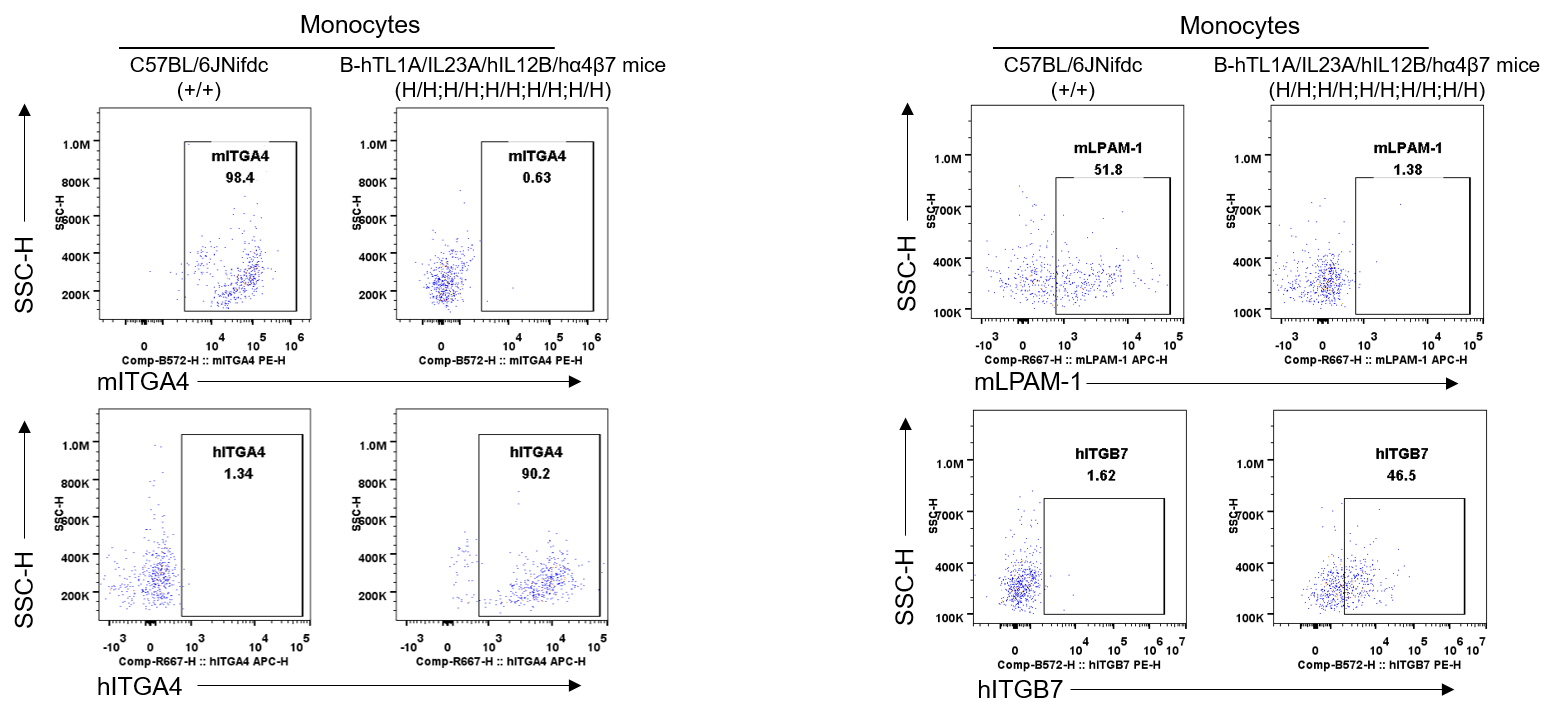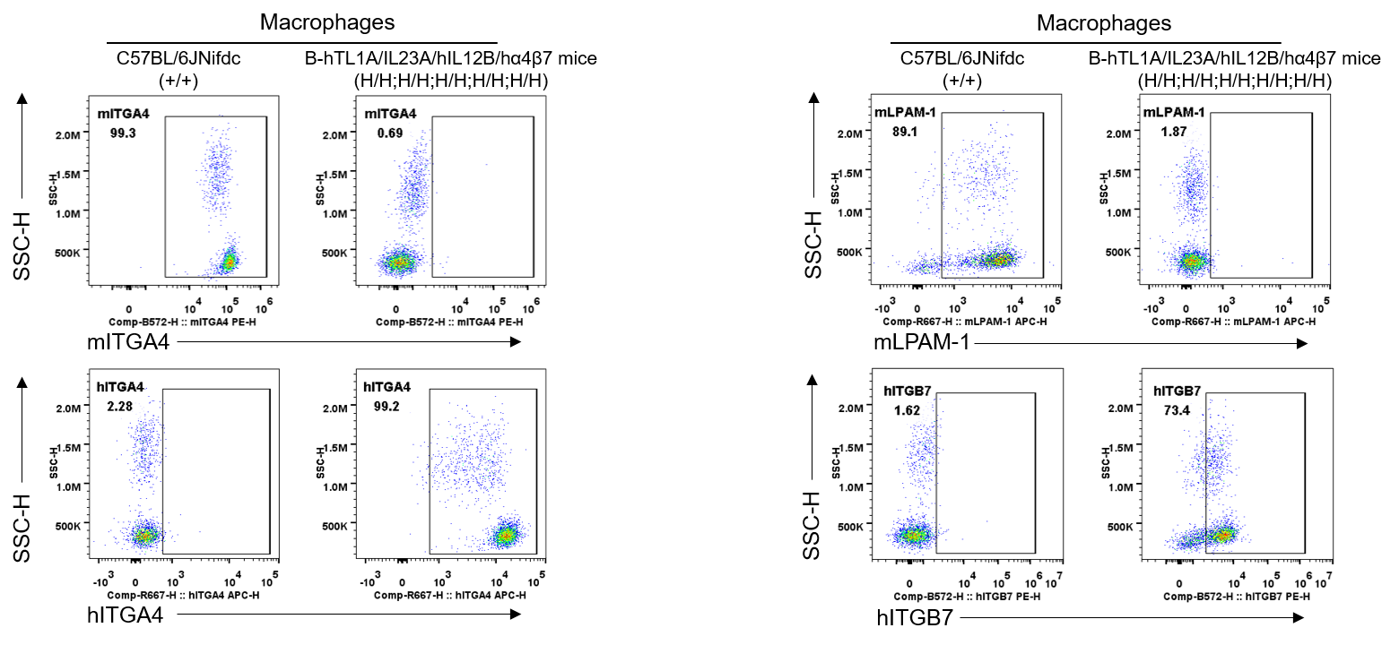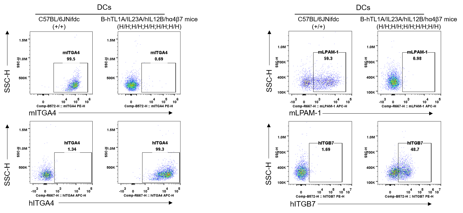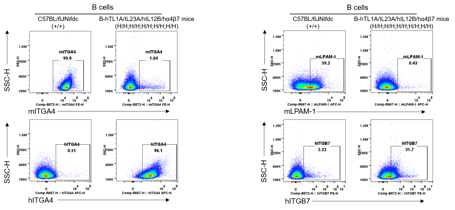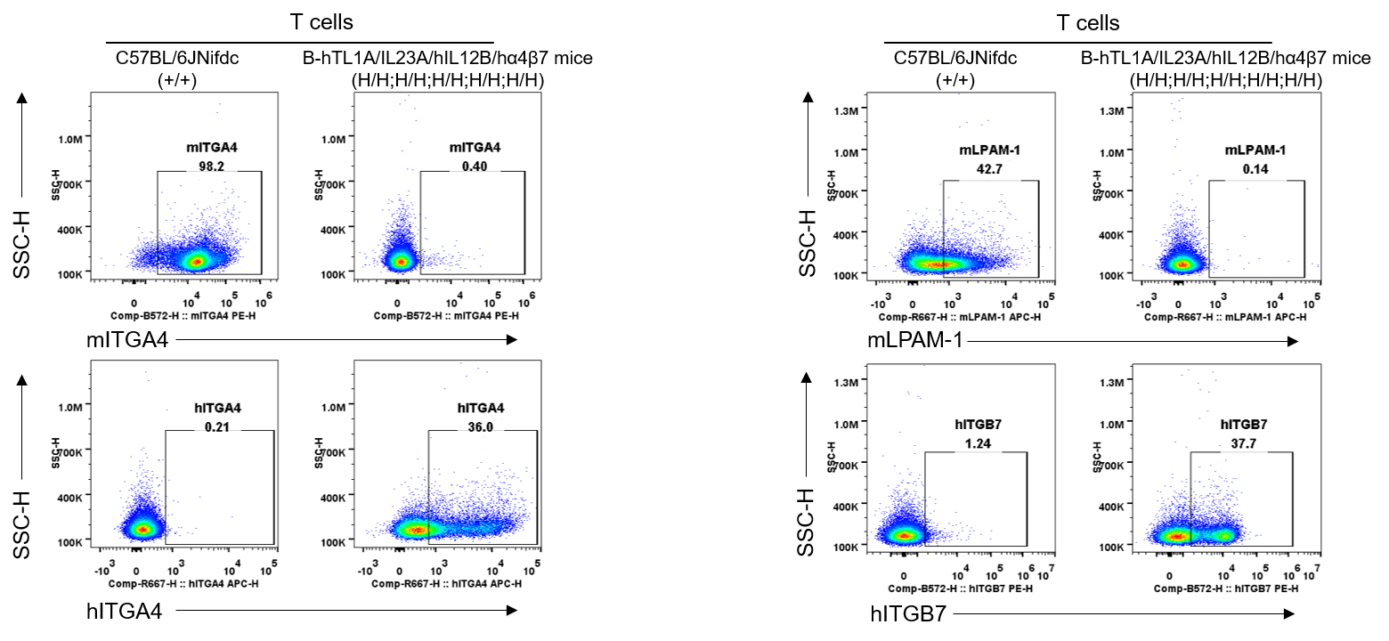Strain specific ITGA4 and ITGB7 expression analysis in wild-type C57BL/6JNifdc mice and homozygous humanized B-hTL1A/hIL23A/hIL12B/hα4β7 mice by flow cytometry. Splenocytes were collected from wild-type C57BL/6JNifdc mice (+/+) and homozygous B-hTL1A/hIL23A/hIL12B/hα4β7 mice (H/H;H/H;H/H;H/H;H/H). Protein expression was analyzed with anti-mouse ITGA4 antibody (Biolegend, 103705), anti-mouse LPAM-1/α4β7 antibody (Biolegend, 120607), anti-human ITGA4 antibody (Biolegend, 304307) anti-human ITGB7 antibody (Invitrogen, MA5-23541) by flow cytometry. Mouse ITGA4 and ITGB7 were only detectable in wild-type C57BL/6JNifdc mice. Human ITGA4 and ITGB7 were exclusively detectable in homozygous B-hTL1A/hIL23A/hIL12B/hα4β7 mice, but not in wild-type C57BL/6JNifdc mice.