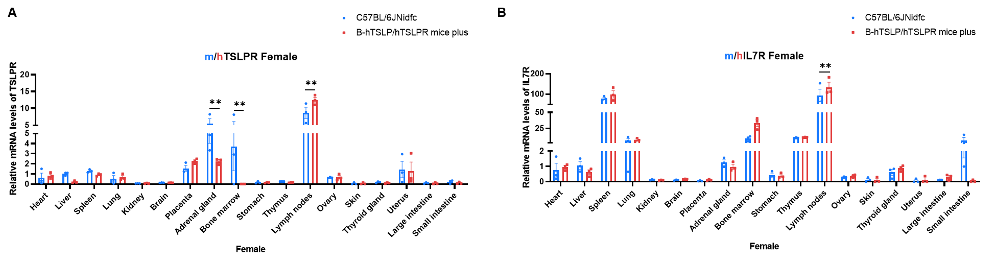 Strain specific analysis of TSLPR and IL7R expression in wild-type C57BL/6JNidfc mice and homozygous B-hTSLP/hTSLPR mice plus by RT-qPCR. Various organizations RNA were isolated from wild-type C57BL/6JNidfc mice (+/+) (n=3, female, 8-week-old) and homozygous B-hTSLP/hTSLPR mice plus (n=3, female, 8-week-old), then cDNA libraries were synthesized by reverse transcription, followed by real-time quantitative PCR with TSLPR and IL7R primers. The mRNA levels of TSLPR and IL7R were in detectable in B-hTSLP/hTSLPR mice plus and wild-type C57BL/6JNidfc mice with Applied Biosystems SYBR. The mRNA levels of TSLPR and IL7R were highly expressed in various immune organs. Values are expressed as mean ± SEM. Significance was determined by two-way ANOVA test.  *P < 0.05, **P < 0.01, ***p < 0.001. Normalize to C57BL/6JNidfc-Liver.