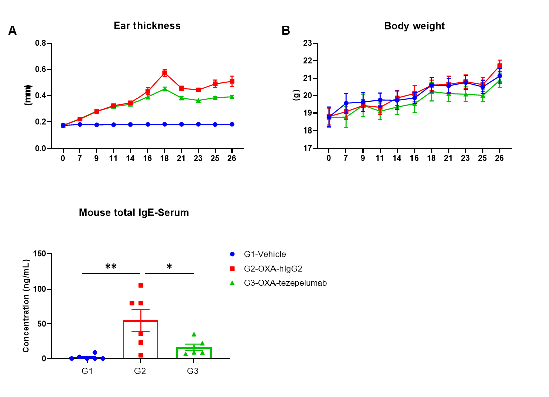 Efficacy of anti-human TSLP antibody in B-hTSLP/hTSLPR mice plus. Mice in each group were treated with anti-hTSLP antibody tezepelumab (in house). (A) Statistical analysis of ear thickness in each group. Epidermis of ear began to desquamate from day 18. So the ear thicknesses were decreased from day 18 as shown in figure. (B) Body weight changes during the treatment. (C) Total IgE levels in serum. Serum was collected on day 26 and total IgE levels were measured by ELISA. (n = 6). Values are expressed as mean ± SEM.