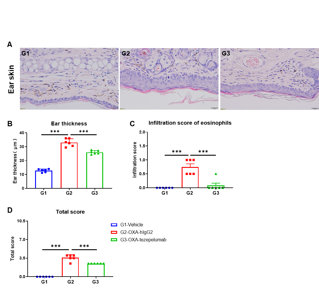 Effects of anti-human TSLP antibody on ear skin of the AD mouse model. (A) Hematoxylin and eosin (H&E) staining. (B) Thickness of ear epidermal skin. (C) Score of eosinophils infiltrated in ear epidermal skin. (D) Total score of ear epidermal skin. Ear thickness and infiltration scores of eosinophils in ear skin of the groups treated with Tezepelumab (in house) were decreased significantly compared to that in the isotype control, demonstrating that the B-hTSLP/hTSLPR mice plus provide a powerful preclinical model for in vivo evaluation of anti-human TSLP antibodies. Infiltration score of eosinophils: 1=slight; 2=mild; 3=moderate; 4=severe. The content of the pathology total score evaluation includes the following aspects: epidermal hyperplasia in skin, erosion/crusting, hyperkeratosis and parakeratosis; inflammatory cell infiltration in dermis and subcutaneous. AD: Atopic dermatitis.